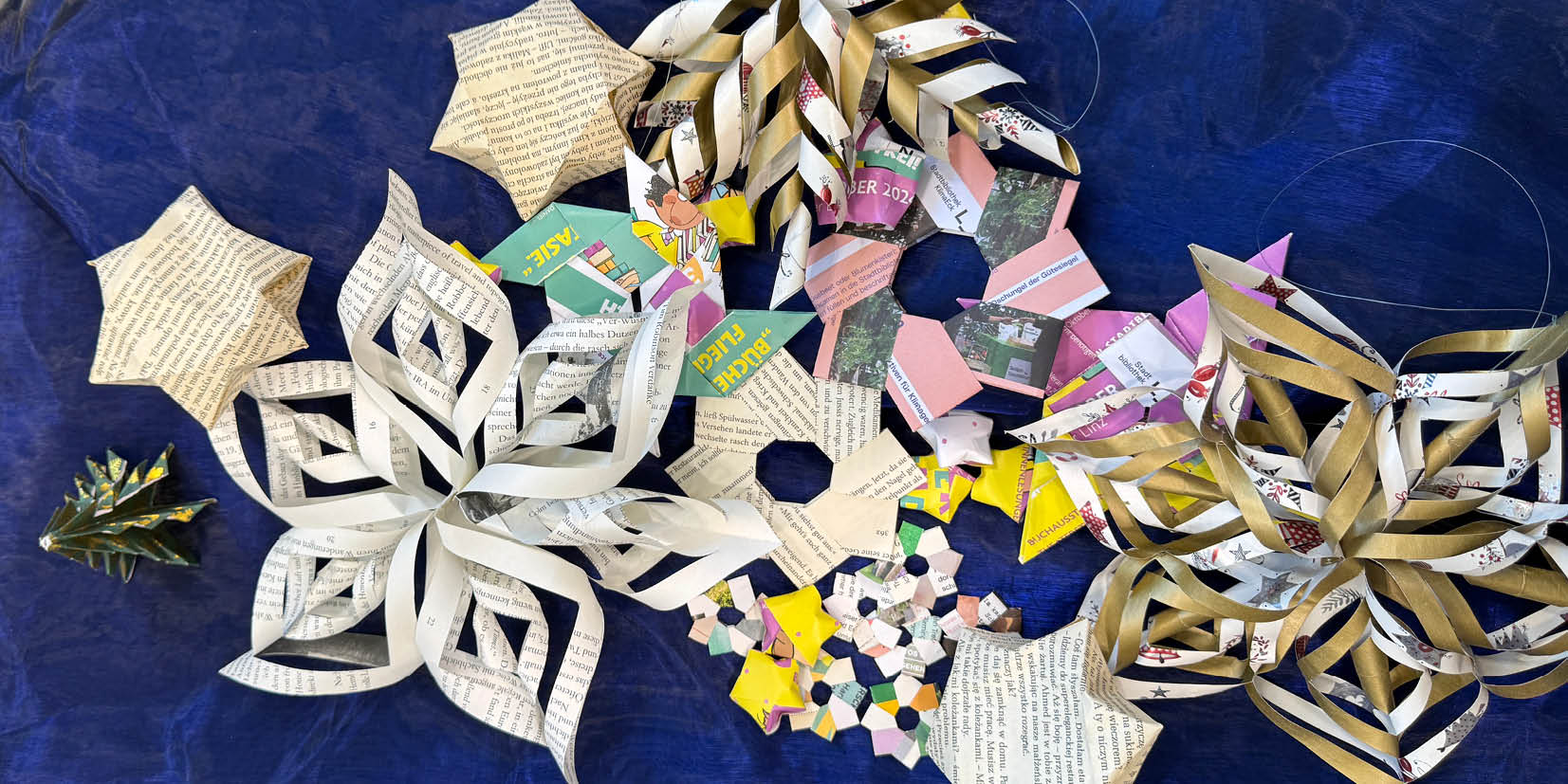 Wir laden Sie ein, in der Bibliothek Platz zu nehmen und aus alten Buchseiten Sterne zu basteln – für unseren nachhaltigen Weihnachtsbaum oder für Ihre Weihnachtsdeko zu Hause! Anleitungen und Bastelmaterial liegen vor Ort bereit.